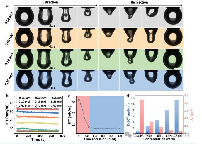 首先,在GL和SSD共組裝之前,用垂滴張力法研究了GL在水-甲苯中的界面行為。如圖1a所示,當(dāng)提取濃度為0.03、0.05、0.10和0.15 mM的甲苯中GL水溶液的液滴時,分別在51、41、26和18 s時,液滴界面面積減小,在液滴界面上出現(xiàn)了明顯的起皺。同樣,當(dāng)液滴完全虹吸到針管中并重新注入到初始體積時,起皺現(xiàn)象重新出現(xiàn),液滴由不規(guī)則逐漸擴(kuò)大到規(guī)則。抽注過程中起皺現(xiàn)象的出現(xiàn),有力地揭示了水-甲苯界面處彈性膜的形成。圖1b測量了GL溶液和甲苯之間的時間分辨界面張力(IFT)。當(dāng)GL濃度<0.03 mM時,甲苯與GL溶液之間的界面張力近似等于純水與甲苯之間的界面張力(≈32 mN·m?1)。隨著GL溶液濃度從0.03增加到0.25 mN·m?1,界面張力下降到6.8 mN·m?1,而從0.25到1.00 mM,界面張力保持在6.8 mN·m?1不變當(dāng)GL濃度<0.03 mM時,甲苯與GL溶液之間的界面張力近似等于純水與甲苯之間的界面張力(≈32 mN·m?1)。隨著GL溶液濃度從0.03增加到0.25 mM,界面張力下降到6.8 mN·m?1,而從0.25到1.00 mM,界面張力保持在6.8 mN·m?1不變。據(jù)此,確定0.25 mM為GL分子在水-甲苯界面處的臨界膠束濃度(CMC)(圖1c)。這意味著液滴在GL的CMC以下會發(fā)生收縮,而在CMC以上液滴會發(fā)生起皺。為了進(jìn)一步解釋這一現(xiàn)象,我們計(jì)算了不同濃度下GL分子的界面吸附容量和截面積。圖1d我們可以看到GL的界面吸附量隨濃度的增加成比例增加,相反,隨著濃度的增加,橫截面積減小。綜上所述,GL是一種特殊的兩親分子,可以在油水界面形成界面膜。