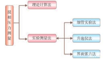 目前測(cè)量混相壓力的方法如圖3所示。國(guó)內(nèi)外許多專家研究了確定最小混相壓力的方法,包括理論計(jì)算和實(shí)驗(yàn)測(cè)定。但是,一般的理論計(jì)算精確度都不高,而實(shí)驗(yàn)測(cè)定方法具有較高的可靠性。實(shí)驗(yàn)測(cè)定方法包括細(xì)管實(shí)驗(yàn)、升泡儀法及界面張力法等。其中,界面張力法是通過(guò)直接測(cè)定注氣相與地層原油間的界面張力來(lái)確定最小混相壓力,既能觀測(cè)到形成混相的狀態(tài),而且操作時(shí)間也較短。細(xì)管實(shí)驗(yàn)法被認(rèn)為是最可靠的測(cè)量最小混相壓力方法,但細(xì)管實(shí)驗(yàn)也有局限性,不能模擬黏性指進(jìn)、重力超覆等因素,實(shí)驗(yàn)周期長(zhǎng),大約需要7~14天,且實(shí)驗(yàn)工作量大。升泡儀法是直接觀察混相過(guò)程,測(cè)量周期短,1h可以完成測(cè)量,測(cè)量結(jié)果受人為因素影響嚴(yán)重。而界面張力法是通過(guò)直接測(cè)定注氣相與地層原油間的界面張力來(lái)確定最小混相壓力,既能觀測(cè)到形成混相的狀態(tài),而且操作時(shí)間也較短,僅需5~6h。