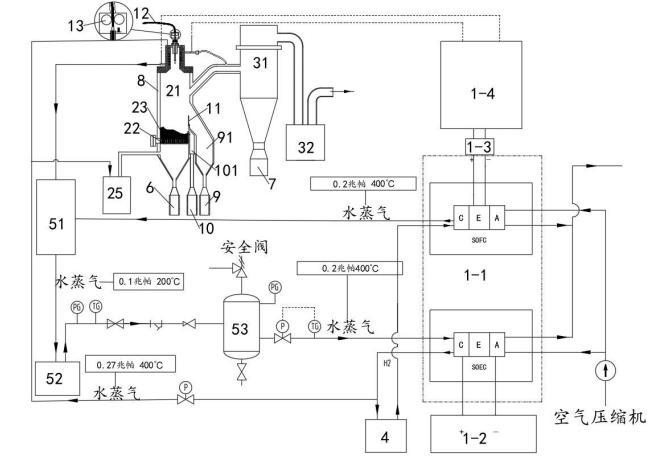 所述供電模塊1中的SOFC燃料電池產(chǎn)生的水蒸氣(0.2Mpa,400℃)進入所述汽水混合加熱器51中,所述等離子噴射模塊2、分離過濾模塊3、粗粉收集罐6、細粉收集罐7與冷卻模塊8換熱后的水(當(dāng)冷卻介質(zhì)為水時)也進入所述汽水混合加熱器51中,通過所述汽水混合加熱器51的作用將其轉(zhuǎn)化為水蒸氣并傳輸?shù)剿稣羝l(fā)生器52中,所述蒸汽發(fā)生器52將水蒸氣以(0.2Mpa,400℃)的狀態(tài)傳輸?shù)椒€(wěn)壓罐53中,通過穩(wěn)壓罐53穩(wěn)壓并去除水蒸氣中夾雜的水滴后,高溫的水蒸氣進入SOEC電解池中參與電解制氫,并通過儲氫模塊4將制備的氫氣存儲備用。該過程將分離提純過程中供電模塊1中燃料電池燃燒放電產(chǎn)生的高溫水蒸氣與冷卻換熱的熱量加以回收利用,為SOEC電解池提供熱量,避免或減少外部能量的輸入,降低成本。