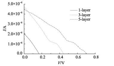 圖5不同層數菠菜類囊體膜LB膜組裝成光電池的I-V曲線