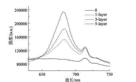 圖4是石莼類囊體膜LB膜在納米ZnO上的室溫熒光發射光譜,類囊體膜的最大熒光發射峰在683 nm,隨著類囊體膜在ZnO上吸附層數的增加熒光發射強度增大。菠菜類囊體膜的熒光發射光譜表現出相同的趨勢(結果未顯示)。