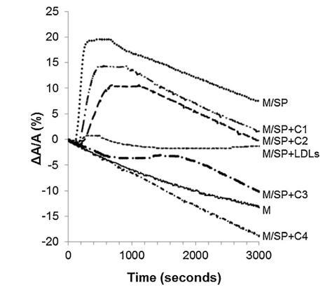 當(dāng)?shù)兔芏戎鞍着c牛精漿混合時(shí) 蛋白質(zhì)重量比為 10:1 (BSP:LDLs) 并注射到單層下方,單層的分子面積隨時(shí)間記錄 幾乎沒(méi)有變化(曲線 M/SP + LDL,圖 5)。 肩膀出現(xiàn)在 大約 400 s 揭示了 BSP 蛋白的弱吸附(這 肩部代表 M/SP 的 5%,上圖曲線)。 然后,該 1000s后分子面積的變化減少并穩(wěn)定。 不會(huì)像 M 和 M/SP 曲線的變化那樣減少, 表明 LDLs 成分的吸附,與 它們?cè)诮缑嫣幍母邤U(kuò)散能力(曲線 M/LDL,圖 4)。 因此,SP 中所含 BSP 蛋白在界面處的吸附 由于低密度脂蛋白而大大降低,并且 BSP/低密度脂蛋白的比率非常高 接近最佳值以完全防止 BSP 蛋白質(zhì)影響單層。 磷脂酰膽堿注射量 根據(jù)低密度脂蛋白的組成估計(jì)為 4.61 毫克 [33]。 因此,注射了 4.61 mg LDLs 的磷脂酰膽堿 26.6mg精漿蛋白質(zhì),即1mg精漿蛋白質(zhì)需要0.17mg磷脂酰膽堿。