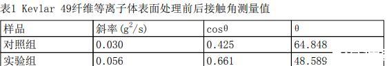 測(cè)量結(jié)果如下表所示,測(cè)量結(jié)果為三次平行樣的平均值??梢?jiàn)經(jīng)等離子體表面處理后,芳綸纖維與水的表面接觸角降低16°,潤(rùn)濕性提高。