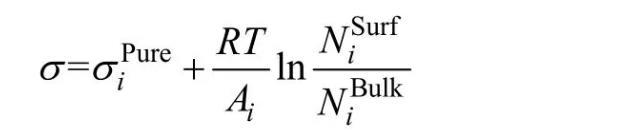 式中:σipure表示純組元和Al2O3)的表面張力;Ai為純組元i的摩爾表面積,其中L為校正因子,熔渣中設為1.091;N0為阿伏加德羅常數,Vi為組元i的摩爾體積);R和T分別表示摩爾氣體常數和絕對溫度;為組元i在表面相或體相的質量作用濃度。