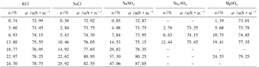 表2 293 K下,無機鹽的質量分數與水溶液界面張力的關系