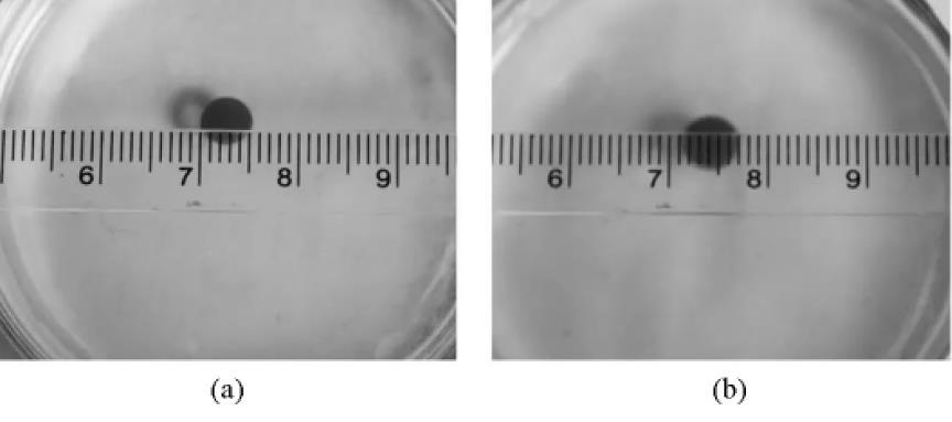 圖3油酸在純水(a)與飽和Na2SO4溶液(b)上形態