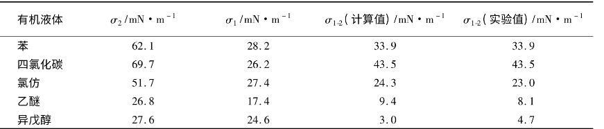 表1給出了幾種有機液體(油)與水接觸時的界面張力理論計算值和實驗測量值的比較。