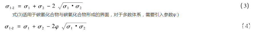 式中φ是與兩液體的摩爾體積及分子間相互作用有關的參數。根據經驗,φ值一般為0.5~1.5。對于水與脂肪酸、醇、醚、酮接觸的體系,其值近似為1;水與飽和烴接觸的體系,其值約為0.55;水與芳烴接觸體系的值約為0.7。