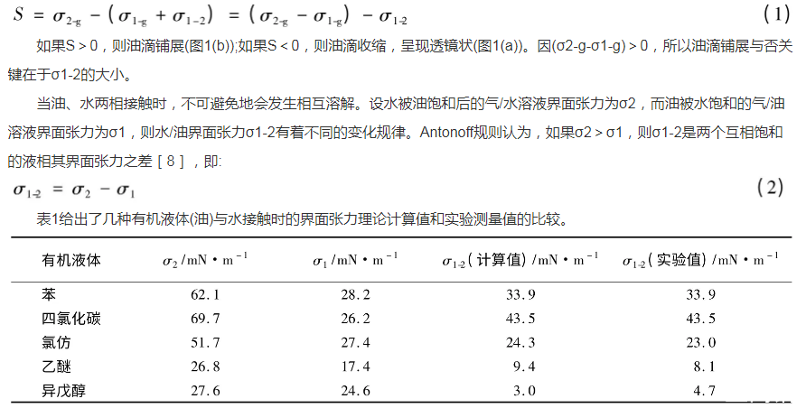 圖1中液體表面存在界面張力[5-6],其值的大小是物質分子間相互作用的一種反映,與物質的本性有關。在常見純液體中,水的界面張力最高,25℃時為72.0mN·m-1,極性有機物液體的界面張力大多低于50mN·m-1,非極性有機液體的界面張力一般更小[7]。由此可知,氣/水界面張力大于氣/油界面張力,即σ2-g>σ1-g。根據鋪展系數(S)的定義:
