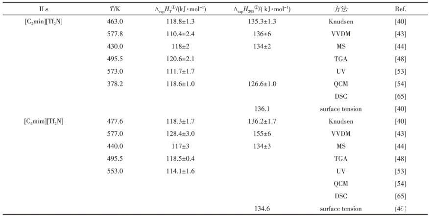 表1用不同實(shí)驗(yàn)方法測定的離子液體[Cnmim][Tf2N](n=2,4)的汽化焓