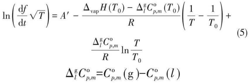 Verevkin等[54]開發(fā)了評(píng)估程序的物理基礎(chǔ),并使用1-乙基-3-甲基咪唑雙(三氟甲磺酰基)酰亞胺[C2mim][Tf2N]進(jìn)行測量,從而將蒸發(fā)焓的測量范圍降低到363 K。和文獻(xiàn)中已有的數(shù)據(jù)相比較,具有一致性。這項(xiàng)工作中開發(fā)的方法也為得到ILs的汽化焓開辟了一條新途徑。經(jīng)過一系列公式推導(dǎo),構(gòu)建了ILs的摩爾汽化焓、頻率損耗率df/dt和溫度的關(guān)系