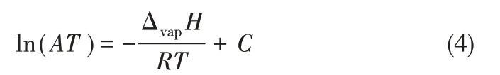 將ln(AT)對(duì)1/T作圖,回歸線性方程,從斜率可以得出ILs的汽化焓數(shù)據(jù)。