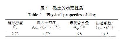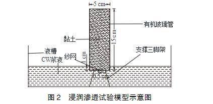 浸潤滲透試驗模型如圖2所示,主要由液槽、支撐三腳架和透明有機玻璃管組成。有機玻璃管直徑5cm,高15cm,頂端敞開,底部封閉鉆有直徑0.5cm的進漿孔。試驗時將黏土裝入有機玻璃管中,振搗壓實,底部開孔處墊有紗網(wǎng),防止土體掉落。將有機玻璃管和支撐三腳架放入漿液槽內(nèi),有機玻璃管底部浸入漿液液面以下1.0cm,使?jié){液從底部滲入黏土中,通過觀察漿液在不同時間的滲透高度來評價漿液的浸潤滲透效果。