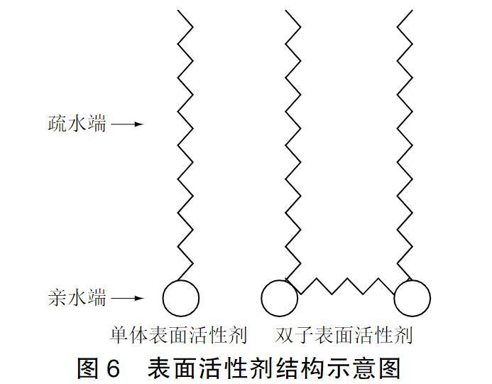 從漿液固化反應機理分析:在CW灌漿材料配方中除環氧樹脂外,還含有糠醛、丙酮等成分。體系中存在3種化學反應,既有環氧基團與固化劑的逐步聚合反應,也有糠醛、丙酮之間а氫的反應,還有糠醛、丙酮與固化劑中胺的反應。隨著反應時間的延長,體系分子量不斷增加,從而導致漿液的表面張力和接觸角均隨時間的延長而不斷增加。從圖3中可以看出加入表面活性劑S1、S2能降低漿液的表面張力和接觸角。這是因為本次漿液改性選用的表面活性劑S1、S2從化學結構上屬于雙子型非離子表面活性劑。傳統表面活性劑和雙子型表面活性劑結構示意圖如圖6所示。親水端疏水端單體表面活性劑雙子表面活性劑。