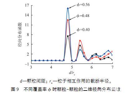 圖9不同覆蓋率?時顆粒-顆粒的二維徑向分布函數(shù)為了研究界面顆粒覆蓋率對界面張力的影響,建立了底面邊長為30rc、高度為40rc的正方體模擬區(qū)域來容納更多的顆粒,分別將不同數(shù)量的顆粒隨機放置于界面上,并采用2種方法計算不同顆粒覆蓋率下的界面張力。