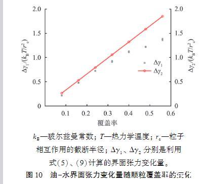 圖10油-水界面張力變化量隨顆粒覆蓋率的變化第二種方法是考慮所有因素對界面張力的影響,利用式(5)計算界面張力的變化Δγ1,如圖10中的黑點所示,黑點中的誤差棒是獨立計算多次結(jié)果得到的誤差。隨著顆粒覆蓋率的增加,界面張力降幅增大。Δγ1和Δγ2的變化趨勢是一致的,都是隨著界面覆蓋率的增大,界面張力降幅增大。在覆蓋率較小時,由于顆粒數(shù)量較少,在界面分布較為稀疏,使得顆粒間相互作用不明顯,因此顆粒間相互作用對界面張力的計算沒有太大的影響,Δγ1和Δγ2變化趨勢基本一致。隨著覆蓋率的增大,Δγ2>Δγ1。由于直接利用吸附能和吸附顆粒數(shù)量計算界面張力存在明顯的局限性,因此接下來要進一步研究顆粒間相互作用對界面張力的影響。
