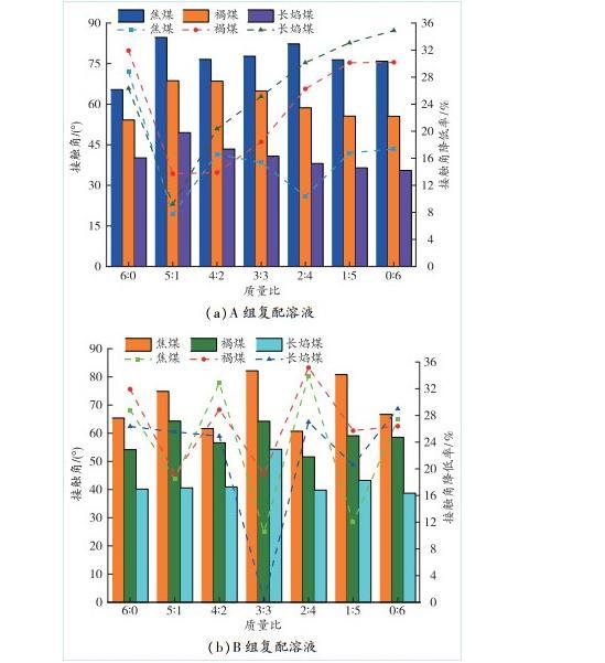 1)與純水相比,復(fù)配后的A、B 2組溶液的接觸角明顯降低,對(duì)于焦煤、褐煤、長(zhǎng)焰煤,B組溶液復(fù)配質(zhì)量比為2∶4時(shí)接觸角降低最多,分別為31.131%,27.969%、14.713%;對(duì)于焦煤,A組溶液復(fù)配質(zhì)量比為6∶0時(shí)接觸角降低最多,為26.452%,對(duì)于褐煤、長(zhǎng)焰煤,A組溶液復(fù)配質(zhì)量比為1∶5時(shí)接觸角降低最多,為25.982%、20.026%。