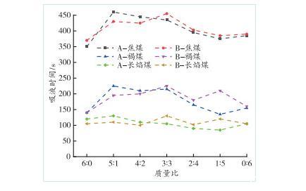 圖6為A、B組復(fù)配溶液與3種煤樣接觸角的對(duì)比圖,不同煤樣吸液時(shí)間變化情況如圖7所示。