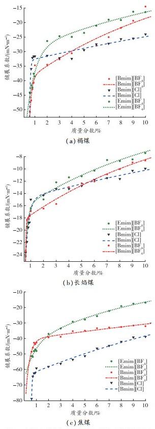 2)3種咪唑類離子液體的鋪展系數(shù)隨離子液體質(zhì)量分?jǐn)?shù)的增大而迅速增大,長(zhǎng)焰煤的親水能力最好,而焦煤的親水能力最差,這與煤中親水基團(tuán)和疏水基團(tuán)的含量有關(guān);