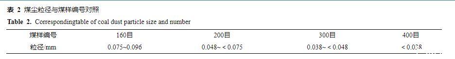 將EMI原液稀釋至質(zhì)量分?jǐn)?shù)分別為0.1%、0.2%、0.4%、0.6%、0.8%、1.0%、2.0%、4.0%、6.0%、8.0%的混合溶液。實驗煤樣選取黃陵一號煤礦弱黏煤樣,煤樣工業(yè)分析結(jié)果見表1。在制備煤塵樣品時,根據(jù)有關(guān)文獻(xiàn)對黃陵一號煤礦綜采工作面煤塵粒徑分布進(jìn)行檢測,并結(jié)合國際標(biāo)準(zhǔn)化組織對粉塵粒徑的定義,以及實驗室制備條件,去除煤塊外表皮,使用破碎機對煤心破碎60 s,用160、200、300、400目標(biāo)準(zhǔn)工業(yè)篩對煤粉進(jìn)行篩分,共篩分出0.075~0.096、0.048~<0.075、0.038~<0.048、<0.038 mm共4個粒度范圍的樣品進(jìn)行實驗,其中煤塵粒徑與煤樣編號見表2。煤樣制備完成后,將其放入80℃的真空干燥箱,真空干燥8 h后密封保存以備實驗使用。
