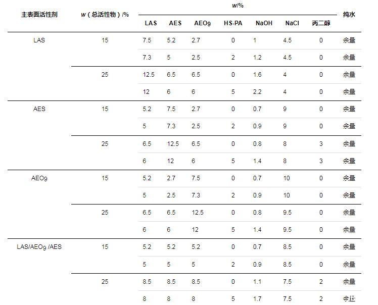由前文可知,不同表面活性劑在膠束形態(tài)、增稠、去污等多個方面均有不同表現(xiàn)。對于結(jié)構(gòu)型洗滌劑,考察不同主表面活性劑的區(qū)別,同時探究了HS-PA在形成結(jié)構(gòu)型洗滌劑中發(fā)揮的作用。與增稠性能類似,不同配方體系形成結(jié)構(gòu)型洗滌劑所需添加的鹽量也不同。因此,在設計配方時,只要求同組的實驗樣品(含HS-PA)和空白樣品(不含HS-PA)的鹽量相同(制備樣品時,以鹽量加至空白組出現(xiàn)剪切變稀的現(xiàn)象為準),具體配方如表2所示(表中LAS、AES已換算為純質(zhì)量分數(shù),HS-PA(w=30%)未換算)。