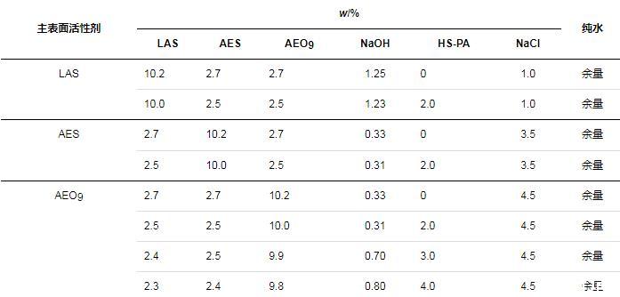 分別考察了在以LAS、AES和AEO9為主要表面活性劑的體系中,HS-PA作為改性聚丙烯酸/酯高分子表面活性劑可發(fā)揮的增稠以及去污效果。在配方設計上,總活性物質(zhì)量分數(shù)約為15%。由于HS-PA的增稠作用需要和NaCl協(xié)同起效,而不同配方的耐鹽性不同,因此,根據(jù)空白組(無HS-PA)配方黏度不反稀的NaCl用量,來確定同組樣品(含HS-PA)的NaCl用量,具體配方如表1所示(表中LAS、AES已換算為純質(zhì)量分數(shù),HS-PA(w=30%)未換算)。