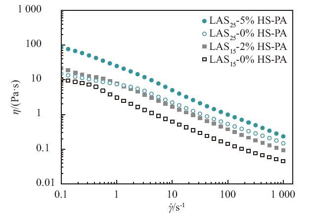 圖7為不同配方洗滌劑的表觀黏度隨剪切速率變化曲線,隨著剪切速率不斷增加,4個樣品的表觀黏度均逐漸減小,表現(xiàn)出剪切變稀的非牛頓流體行為。在恒定剪切速率下,體系中加入HS-PA將提高洗滌劑的黏度。結(jié)合偏光顯微鏡圖像可知,HS-PA的加入使得分子空間堆積構(gòu)型發(fā)生改變,體系中出現(xiàn)更多的球形層狀液晶,液晶結(jié)構(gòu)越多越完整,則說明其形成的聚集體中,分子排布越緊密且越有序,層間發(fā)生滑動時越困難,宏觀表現(xiàn)為黏度越大。當無HS-PA影響時,在相同剪切速率下,活性物質(zhì)量分數(shù)越高,黏度越大。這可能是因為活性物質(zhì)量分數(shù)越大,表面活性劑分子之間作用力越強,分子鏈發(fā)生相對運動時的阻礙效果越明顯,黏度則越大。