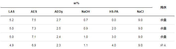 考察了一種重均分子量為4 244,表面張力為42.06 mN/m的聚醚-聚丙烯酸/酯高分子表面活性劑HS-PA在非結(jié)構(gòu)型洗滌劑和結(jié)構(gòu)型洗滌劑中的應用性能。經(jīng)激光粒度儀測定,與單一的低分子量表面活性劑膠束相比,當HS-PA分別和LAS/AES/AEO9形成混合膠束時,聚集體的平均粒徑將增大。HS-PA在非結(jié)構(gòu)型/結(jié)構(gòu)型洗滌劑中的應用性結(jié)論如下: