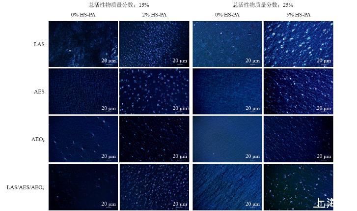 圖5為結(jié)構(gòu)型洗滌劑的偏光紋理圖(表2中的配方,以“主表面活性劑—總活性物質(zhì)量分數(shù)—HS-PA質(zhì)量分數(shù)”區(qū)分)。從圖中可以明顯看出,在分別以LAS、AES和AEO9為主表面活性劑的配方中,當總活性物質(zhì)量分數(shù)約為15%或者25%時,加入HS-PA后,偏光圖像中的馬耳他十字液晶形狀均明顯增多。馬耳他十字是球形層狀液晶的典型織構(gòu),說明了HS-PA的加入有利于體系形成球形層狀液晶。當體系中不含HS-PA時,偏光視野并非完全暗場,而是有微弱的油狀條紋或者少量的馬耳他十字,表明其中也具有部分平面或者球形層狀液晶結(jié)構(gòu),但液晶較弱。不同主表面活性劑的層狀液晶結(jié)構(gòu)存在一些區(qū)別,AEO9為主表面活性劑的配方,其十字花紋理直徑為2~3μm,小于LAS、AES以及三元表面活性劑平衡體系的十字花紋理直徑(7~10μm)。以上結(jié)果與HS-PA復配體系中的粒徑分布變化相吻合:當HS-PA與低分子量表面活性劑復配時,LAS/AES與HS-PA的混合膠束粒徑明顯變大,但AEO9與HS-PA的混合膠束粒徑只略微變大。根據(jù)球形層狀液晶的結(jié)構(gòu)可知,其內(nèi)部混合膠束粒徑越大,則相應的液晶粒徑越大。對于除AEO9外的其他3種體系而言,總活性物質(zhì)量分數(shù)從15%提高到25%,HS-PA加量從2%增加至5%,球形層狀液晶的粒徑會相應增大,此現(xiàn)象在LAS為主表面活性劑以及LAS較多的三元表面活性劑平衡體系中更為明顯。