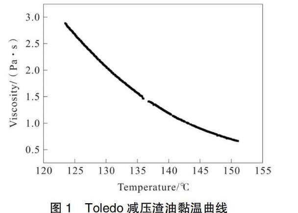 考慮到上述因素,本文在根據(jù)現(xiàn)有儀器測得的相對較低溫度條件下的黏溫曲線關(guān)系的基礎上進行了減壓渣油較高溫度條件下黏溫關(guān)系的計算近似,以求對減壓渣油反應模型進行較為準確的理論模型建立的指導。就目前的技術(shù)而言,在缺少直接測量儀器以及相關(guān)行業(yè)標準的情況下,利用模型進行計算模擬近似,是最具說服性地技術(shù)手段。圖1為實驗室中實際測得的在相對較低溫度下Toledo減渣的黏溫曲線。
