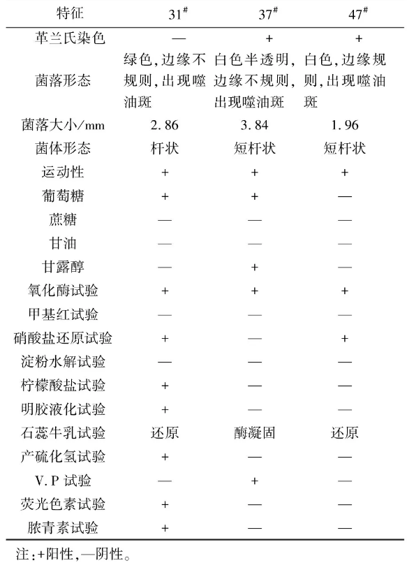 對(duì)篩選所得菌株進(jìn)行常規(guī)生理生化特性實(shí)驗(yàn),結(jié)果如表2所示。根據(jù)表2所示結(jié)果和《伯杰氏(Berge)菌種鑒定手冊(cè)》的描述,可鑒定菌株31#為假單孢屬,菌株37#、47#均為芽孢桿菌屬。