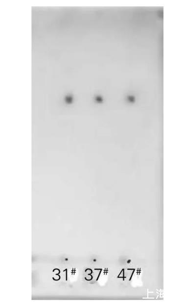 將菌株31#、37#和47#于30℃培養(yǎng)后,對(duì)發(fā)酵液萃取所得生物表面活性劑粗制品進(jìn)行硅膠薄層層析,結(jié)果如圖4所示。將萃取所得生物表面活性劑粗制品進(jìn)行酸解,硅膠薄層層析結(jié)果如圖5所示。