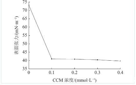 (2)CCM的加入可明顯降低水溶液的表面張力,當CCM濃度為0.1 mmol/L時,溶液表面張力為41 mN/m,繼續增大CCM濃度,溶液表面張力幾乎不變。因此,CCM的臨界膠束濃度約為0.1 mmol/L。