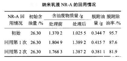 將已處理過含油廢物的納米乳液分離后進行收集,然后進行重復處理新的含油廢物。納米乳液和含油廢物按劑固比2∶1混合后,用磁力攪拌器在1 000 r/min下攪拌20 min,實驗溫度為25℃,測量含油廢物經(jīng)不同回用次數(shù)的納米乳液脫附處理前后的含油量,計算脫附除油率,測試結(jié)果見下表。