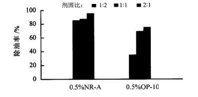 從圖2的脫附除油率來看,當納米乳液濃度在0.5%時,除油效果最佳,脫附除油率達到95.7%;當納米乳液濃度達到5%時,脫附除油下降一半,說明濃度過高的納米乳液反而降低了它的脫附除油效果;在低濃度下(0~1%),納米乳液和含油廢物按劑固比為2∶1處理含油廢物時,脫附效果優(yōu)于劑固比為1∶1的脫附效果。將0.5%的納米乳液NR-A與同濃度下的OP-10進行脫附除油對比,實驗結(jié)果如圖3所示。從圖3的脫附除油率可以看出,當劑固比為1∶2時,納米乳液NR-A的脫附除油率(85.49%)是OP-10(34.73%)的2倍多;當劑固比達到2∶1時,納米乳液NR-A的脫附除油率(95.74%)仍比OP-10(74.1%)高出20%。由此說明納米乳液NR-A的脫附除油效果遠遠超過常規(guī)表面活性劑。