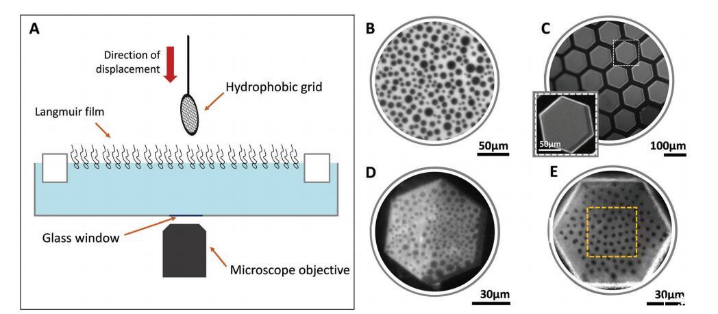 圖 1 用于生成和觀察朗繆爾單層和平面獨(dú)立雙層的實(shí)驗(yàn)裝置 (A)。 代表性圖像顯示 表面壓力為 28 mN m 的中性朗繆爾單層膜? 1 (B), 轉(zhuǎn)移后立即包含多個(gè)同質(zhì)雙層 (C) 的網(wǎng)格, 和 突出顯示的孔(C 中的插圖)的放大圖,以及顯示相共存的中性 (D) 和帶電雙層 (E)。 橙色虛線方塊 (E) 中顯示的是用于分析的區(qū)域的示例。