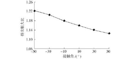 表面張力系數為50N/mm時,接觸角取值:-50°~50°。數值模擬計算得到的擠出脹大比值如圖6所示。