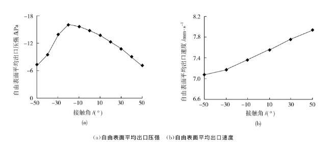 表面張力系數取50N/mm,接觸角取值為-50°~50°時得到的自由表面出口壓強與自由表面出口平均速度曲線如圖10所示。