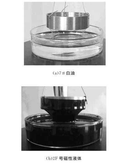 力敏傳感器定標(biāo)數(shù)據(jù)見表1,使用Origin軟件對(duì)直線進(jìn)行擬合,可得力敏傳感器靈敏度B=7.727V/N.測(cè)量無(wú)外加磁場(chǎng)作用的磁性液體表面張力系數(shù)時(shí),為直觀觀察拉脫時(shí)液膜的變化過程,將培養(yǎng)皿放置于電磁線圈端部進(jìn)行測(cè)量,圖3為拉脫過程中某一瞬間液膜的收縮狀態(tài),從圖中可看到,磁性液體的液膜拉得更長(zhǎng),液膜收縮的趨勢(shì)比白油更明顯,這主要是因?yàn)榇判砸后w中加入的表面活性劑降低了其表面張力。可從表面張力形成原理來(lái)分析其中的原因:第一,液體表面張力系數(shù)的大小宏觀上反映出液體表面具有自動(dòng)收縮的趨勢(shì),表面張力系數(shù)較大的白油由于分子和分子之間的引力較大,表面層分子更容易向液體內(nèi)部運(yùn)動(dòng),某一拉力作用下,液膜斷裂,不易拉起較長(zhǎng)的液膜;第二,不同液體對(duì)同一種固體的浸潤(rùn)程度不一樣,表面張力系數(shù)小的液體(0.03N/m左右),幾乎能浸潤(rùn)一切固體;表面張力系數(shù)較大的液體,只能浸潤(rùn)某些固體;7#白油的表面張力系數(shù)大于磁性液體,片狀吊環(huán)和磁性液體的結(jié)合力大于片狀吊環(huán)和7#白油的結(jié)合力;液膜不容易和片狀吊環(huán)脫離,拉起來(lái)的液膜比較長(zhǎng)。