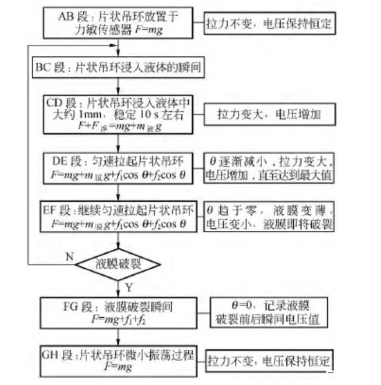 根據受力情況將圖4的液膜拉脫過程電壓變化曲線分為6個階段,圖5為液膜拉脫過程方框圖,不同階段片狀吊環的受力情況不同,電壓變化值也不同,在液膜破裂前后瞬間,忽略液膜的重力,表面張力與重力方向完全一致,此時F=mg+f1+f2,可得到液體的表面張力。由圖4發現,不同液體在EF階段的電壓變化情況不同,無外加磁場作用時2F號磁性液體在EF階段存在轉折點Q,越過轉折點,QF階段電壓變化較平緩,且表面張力越?。欢?#白油和1F磁性液體并未出現此現象。出現該現象的原因是7#白油和1F磁性液體表面張力較大,當液膜被拉脫到一定程度時,很快破裂;而2F號磁性液體由于表面張力較小,液體分子與分子之間的作用力減弱,宏觀表現為拉脫的液膜更長,液膜在空氣中會存在一段時間,此時液膜質量很小,可忽略不計,電壓變化較平緩。有外加磁場作用時,1F和2F號磁性液體在FG階段并未出現電壓變化平緩的中間過程,但有外加磁場作用于磁性液體時,FG階段出現了一些數據點,液膜破裂的時間大于無外加磁場作用時的時間,主要是由于外加磁場增強了磁性顆粒之間的相互作用,分子和分子之間的磁吸引力增強,導致液膜逐步破裂。