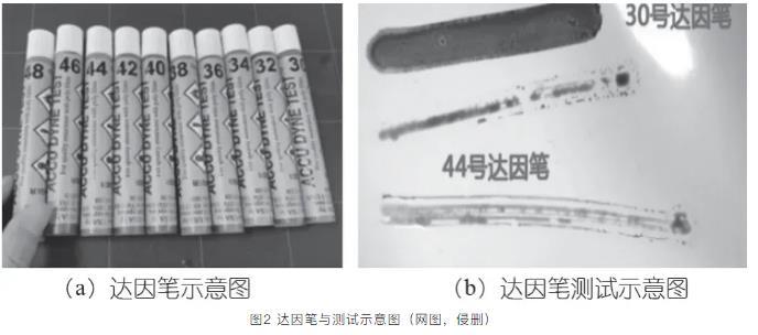 測(cè)試前先確定環(huán)境溫度、空氣濕度、以及被測(cè)物體表面溫度是否達(dá)到達(dá)因筆標(biāo)定的標(biāo)準(zhǔn)條件(溫差越大,測(cè)量誤差越大)。測(cè)試方法圖2(b)所示塑料袋張力測(cè)試,當(dāng)30mN/m筆測(cè)試時(shí),在2 s內(nèi)達(dá)因筆潤(rùn)濕了基材表面,沒有收縮或分散情況,說明表面張力等于或大于30 mN/m;當(dāng)44 mN/m筆測(cè)試時(shí),在2 s內(nèi)達(dá)因筆沒有潤(rùn)濕了基材表面,出現(xiàn)收縮或分散水珠情況,說明表面張力小于44 mN/m。還可用大于30 mN/m筆測(cè)量,以此類推,直到測(cè)試結(jié)果在2 s內(nèi)改縮成水珠(球狀),則這測(cè)試之前一次的值被視為基材表面能,并作比較用。塑料袋PP材質(zhì)在溫度20℃時(shí)表面張力是31~33 mN/m。達(dá)因筆使用方便,保質(zhì)期為6個(gè)月。