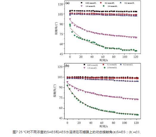 圖7 25℃時(shí)不同濃度的SAES和AES水溶液在石蠟?zāi)ど系膭?dòng)態(tài)接觸角(a)SAES;(b)AES。