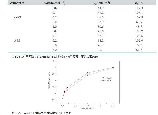 表3 25℃時(shí)不同濃度的SAES和AES水溶液的γlg值及其在石蠟表面的θ0