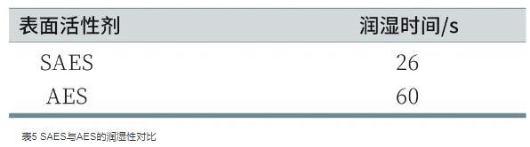 潤濕性是表面活性劑的基本應(yīng)用性能之一。帆布沉降法測(cè)定的是表面活性劑溶液對(duì)棉布的潤濕效果,潤濕過程的快慢取決于表面活性劑的性質(zhì)。由表5可知,SAES、AES對(duì)帆布片的潤濕時(shí)間分別為26 s和60 s,表明SAES的潤濕性優(yōu)于AES,這是由于SAES結(jié)構(gòu)中存在支鏈,表面活性劑分子從水溶液中遷移到氣-液界面的速率較快,容易擴(kuò)散到纖維表面,降低帆布片表面張力的能力較強(qiáng),從而具有較好的潤濕性。