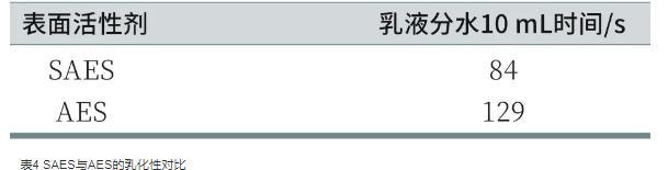 乳化作用是在一定的外力作用下使不混溶的兩種液體形成具有一定穩(wěn)定性的液液分散體系的作用,該分散體系被稱為乳狀液,是一種熱力學(xué)不穩(wěn)定體系。為了評(píng)估SAES和AES的乳化性,采用量筒法測(cè)定了二者對(duì)液體石蠟的乳化能力,記錄從乳液中分離出10 mL水所需要的時(shí)間,時(shí)間越長,乳化性能越好。SAES與AES的乳化性對(duì)比如表4所示。從表中可以看出,SAES的乳化性低于AES,這可能是因?yàn)镾AES分子中的支鏈結(jié)構(gòu),使得其分子總體積相對(duì)較大,在空間位阻以及電性斥力作用使疏水基難以插入油相中,即與液體石蠟之間的相互作用較弱,乳化性較差。