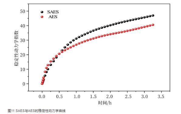 穩(wěn)定性動(dòng)力學(xué)指數(shù)(di)反映的是樣品在整個(gè)放置時(shí)間濃度和顆粒粒徑的變化幅度的綜合值,穩(wěn)定性動(dòng)力學(xué)指數(shù)越大,系統(tǒng)越不穩(wěn)定。圖11為SAES與AES的穩(wěn)定性動(dòng)力學(xué)曲線,從圖中可以看出,在開始的0.5 h內(nèi),SAES與AES的穩(wěn)定性動(dòng)力學(xué)指數(shù)幾乎相同,但隨著時(shí)間的增加,SAES的穩(wěn)定性動(dòng)力學(xué)指數(shù)明顯高于AES,說明在開始的0.5 h內(nèi),二者的泡沫穩(wěn)定性幾乎相同,但是隨著時(shí)間的延長,SAES體系的穩(wěn)泡性明顯弱于AES,這是由于帶有一定支鏈的SAES分子在氣-液界面上形成的表面膜黏度低,不夠緊密結(jié)實(shí),泡沫穩(wěn)定性較差。