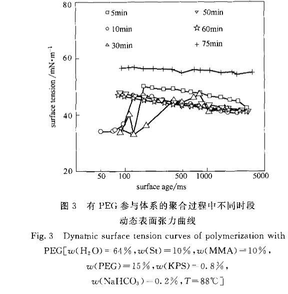 由于PEG的存在,使St/MMA在水相中經歷了不一樣的聚合過程,PEG會使體系的反應速率變慢,當反應到50min時轉化率只有49,而無PEG參與的體系在30min時聚合已接近終點,轉化率達到98以上。St/MMA和引發劑形成的聚合物在PEG的作用下,形成了一種具有更強表面活性的聚合物,其表面活性水平高于PEG以及無PEG參與的聚合體系的聚合物,但弱于混合單體及齊聚物。這種較強表面活性的聚合物在轉化率只有5的時候就已經存在,是聚合物進入粒子堆形成小粒子且穩定粒子的動力,并最終使粒子帶有足夠脫離粒子堆的表面電荷。
