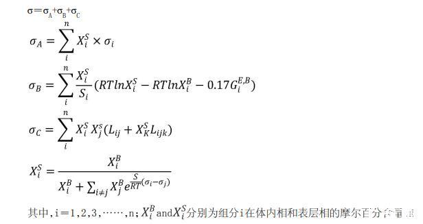 在一些實(shí)施方式中,基于表面張力模型和最優(yōu)擬合參數(shù)計(jì)算高階多元合金的表面張力包括: