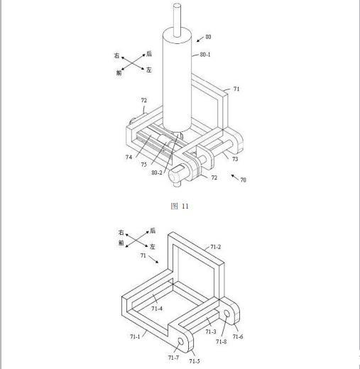 如圖12所示,固定座71整體呈L形,固定座71包括座體部71-1和背體部71-2,座體部71-1和背體部71-2均整體呈長方形,座體部71-1為閉合的環(huán)狀框體結(jié)構(gòu)且位于水平面內(nèi),背體部71-2為U形框體結(jié)構(gòu)且位于豎直面內(nèi),背體部71-2的下端與座體部71-1的后邊框固定連接使得二者整體呈L形,并且背體部71-2與座體部71-1的后邊框形成一個閉合的環(huán)狀框體結(jié)構(gòu)。座體部71-1的左邊框包括上下設(shè)置的兩根棱柱,該兩根棱柱相互平行且二者之間設(shè)置有第一方孔71-3;座體部71-1的右邊框包括上下設(shè)置的兩根棱柱,該兩根棱柱相互平行且二者之間設(shè)置有第二方孔71-4;第一方孔71-3和第二方孔71-4均沿前后方向延伸。座體部71-1的左邊框的左側(cè)面(即外側(cè)面)上固定設(shè)置有第一延伸板71-5和第二延伸板71-6,并且第一延伸板71-5和第二延伸板71-6分別位于座體部71-1的左邊框的前后兩端,第一延伸板71-5上設(shè)置有沿前后方向延伸的通孔71-7,第二延伸板71-6上設(shè)置有沿前后方向延伸的通孔71-8。