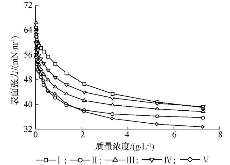 2.2.1 CMC及γCMC將5種聚萜烯馬來酸酐聚乙二醇酯高分子表面活性劑配成一定濃度的水溶液,通過Wilhelmy板測試法,利用Sigma 701表面張力儀測定,作出γCMC-濃度(C)曲線,如圖3所示。
